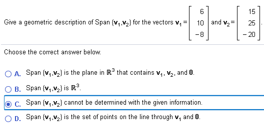 AWe need to give a geometric description of Span v1v2v3We are given v1 214v2 115 and v3 326Now lets combine them into one matrix and row reduce it. The invention of the cell phone b. If there is at least one solution then it is in the span.
