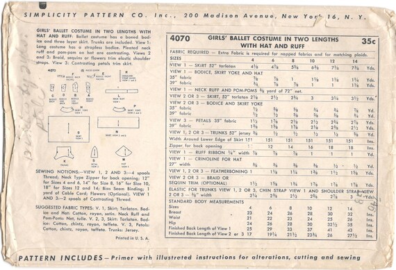 Simplicity 4070 1950s Girls Ballerina Costume Pattern Dress Etsy